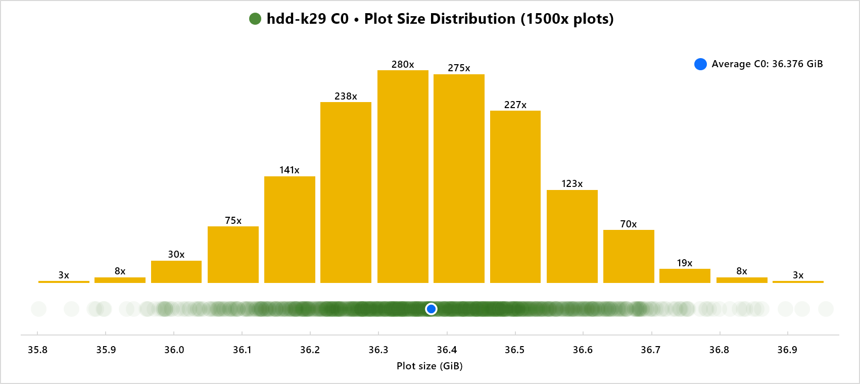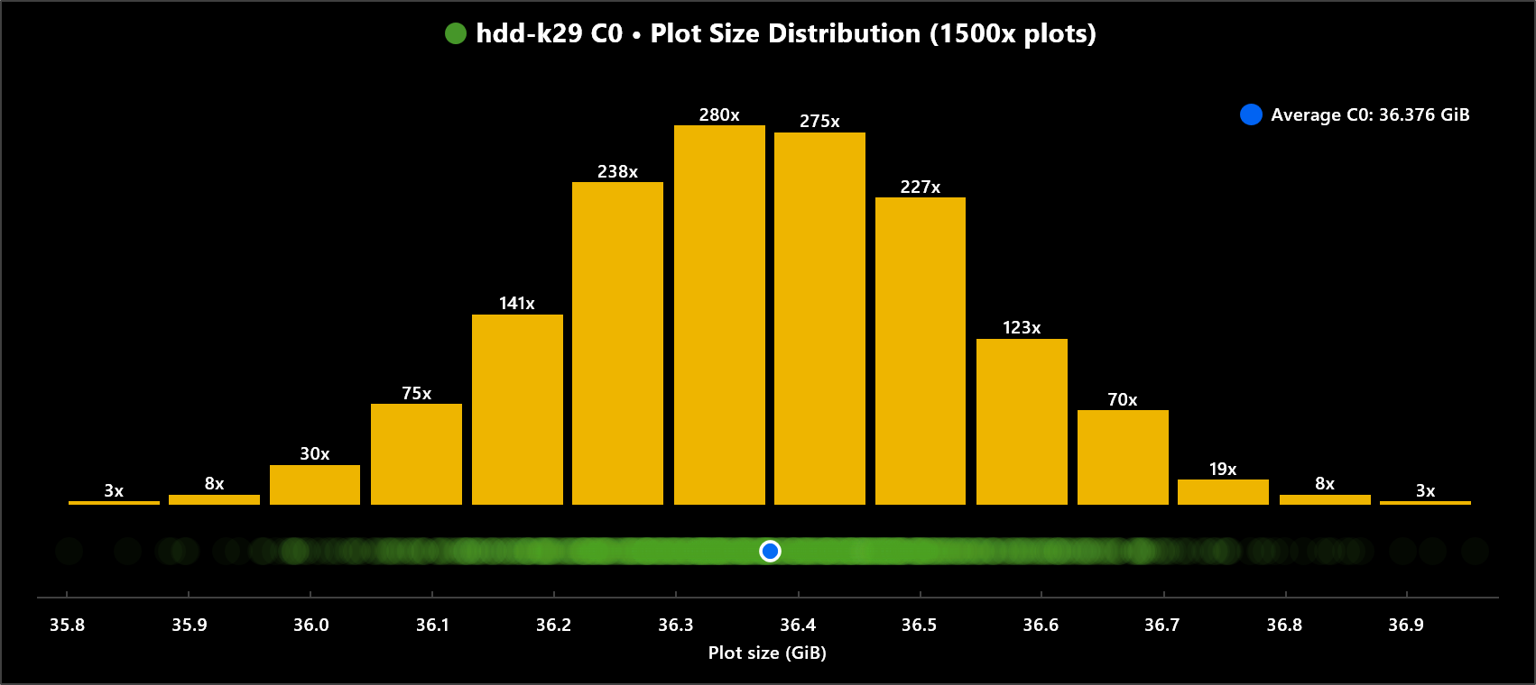 Nearly all plots will be within a 99.5% GiB range, with average plot size in middle. Given enough plots there will be a few outliers, but not many. 99.5% is a representative value for a practical range. GiB numbers with one decimal place have been rounded up and down to best fit purpose. Less chance of underestimating average plot sizes and range values.